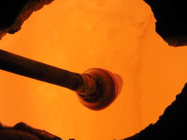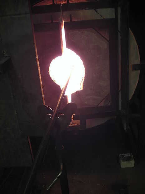 Cuando ya tienes bastante frita en su vaso, coloque la punta de vidrio en el glory hole para calentar la frita hasta la misma temperatura que el vidrio fundido.
