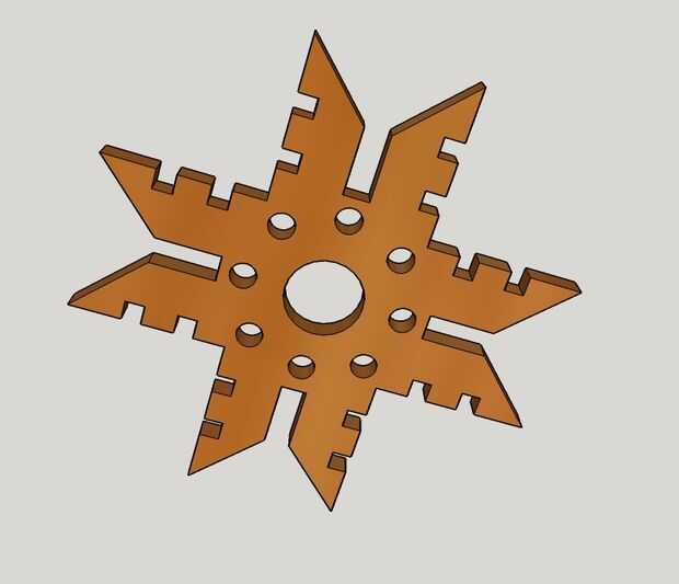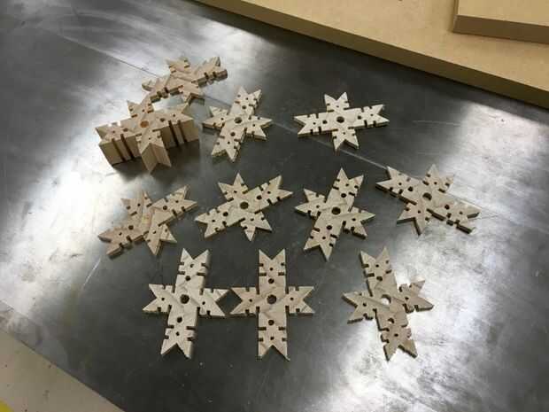 Crear diferentes formas variando las ranuras y agujeros. Use un cortador láser para grabar los nombres en el copo de nieve. Hacer a un Portavelas cortando un 3/4" espesor 'slice' y perfore un agujero de centro para su vela. Utilizar las copos de nieve/estrellas como posavasos o como etiquetas de regalo. Montar varios 3/4 gruesos copos de nieve en un posafuentes.