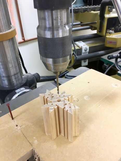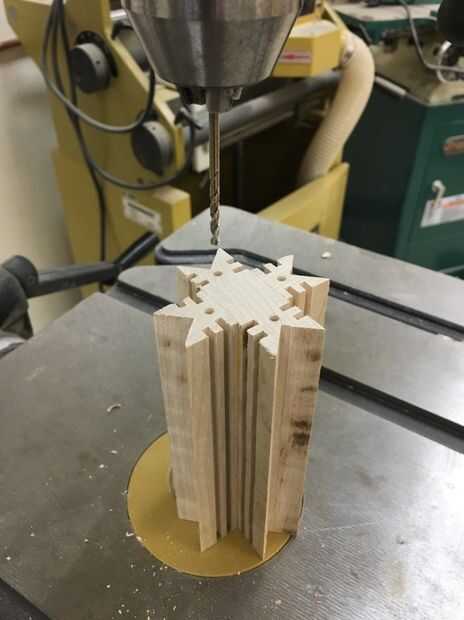 Recorte el extremo de este espacio en blanco con una banda o mano-Sierra para obtener una superficie plana de extremo. Luego coloque el extremo plano del blanco en la mesa del taladro y taladre orificios de 1/16", 1/8" o 1/4" en el espacio en blanco. Estos agujeros son puramente para fines decorativos, vea ejemplos. Elegir un dibujo que te gusta; pero deje suficiente madera entre los lados y agujeros para que los copos de nieve no sea demasiado frágiles.
