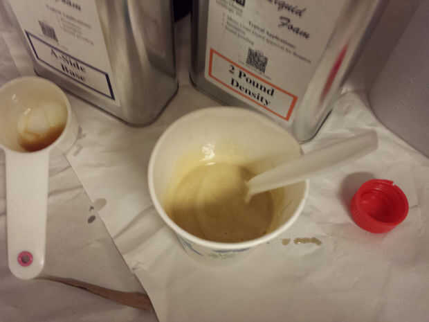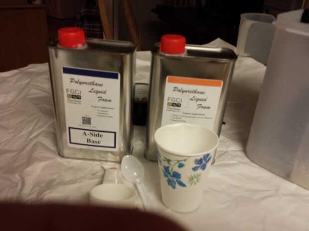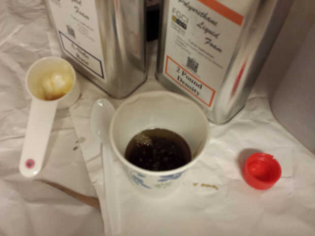 Nota: La espuma se expande mucho. Lo que tengo expande 16:1. Sólo necesitaba unos 125ml (4oz) de cada componente para casi llenar el recipiente.