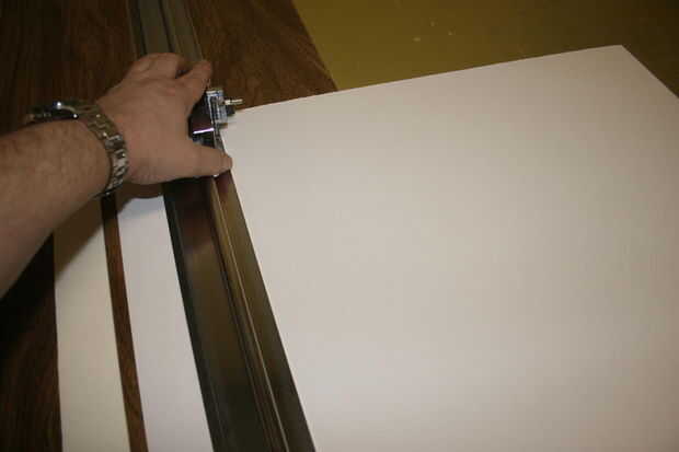 Use un cortador de borde y caja recta o un cortador de lámina perimétrica y corte 2 piezas de lámina perimétrica y 1 pedazo de cartón del mismo tamaño. Generalmente trabajo en 14 x 17 piezas de papel para hacer mis tarjetas 16 x 19. Hacer suyo cualquier tamaño que desee.