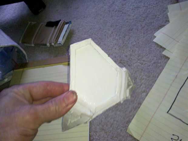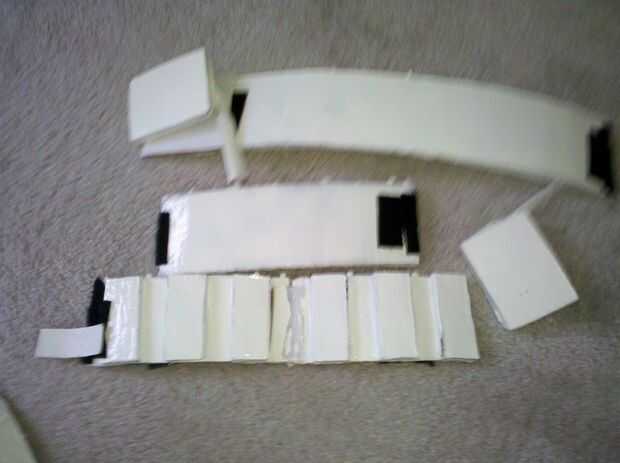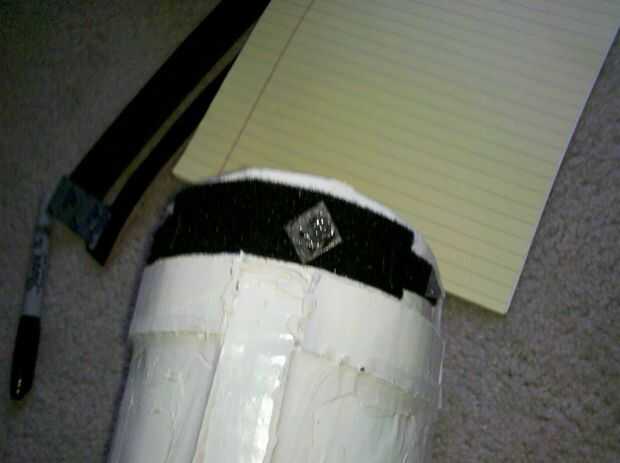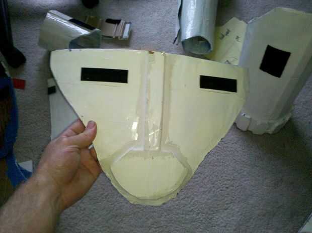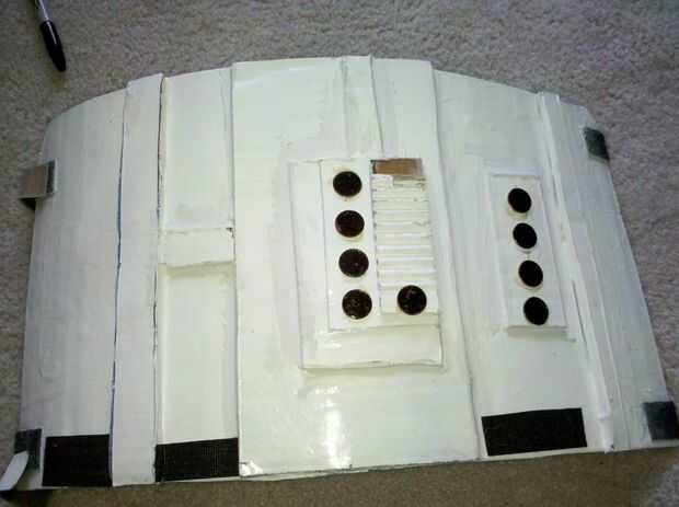El pecho, la rodilla, ingle y hombros y cinturón son solo montones de capas de cartón, tamaño corte a apropiado con una navaja. Entonces usando pintor que me gusta el borde expuesto que ocultó el corrugación y mi capa final de resina de fibra de vidrio aplicada.