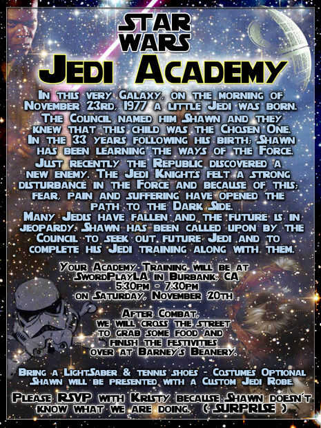 Para una invitación, sólo utilicé mis conocimientos de diseño gráfico y lanzaron juntos un nerdly invitan al correo electrónico a los pueblos. Me aseguré de incluir estrellas, galaxias, personajes favoritos y así sucesivamente. Si usted conoce a alguien que puede hacerlo, que es grande. Si no es así, usted puede contratarme. Hhaha. :) Pero si lo tienes en alta resolución, puede tener impreso y enmarcado como un recordatorio de la fiesta cool, si quería. Echar un vistazo a mi invitación para tener una idea del marco de texto y cómo funciona con el evento!