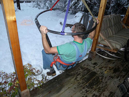 "Sabe usted los exercizers de bebé que cuelgan en la puerta - creo que se llaman Johnny Jump-Ups. Suspensión al bebé con cordones elásticos, y el bebé puede saltar y patear sin caer. Creo que sería una manera de hacer algo así para un adulto no es válido, para apoyar su peso corporal mientras que les permite pasar a la música."