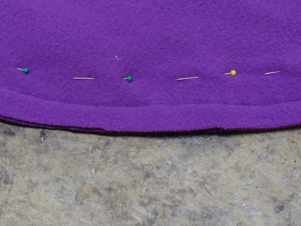 Lugar los dos trozos uno encima del otro la campana y asegúrese de que los lados de marcador son en el exterior. Pin el a lo largo de la gran curva del borde y coser los dos pedazos juntos.