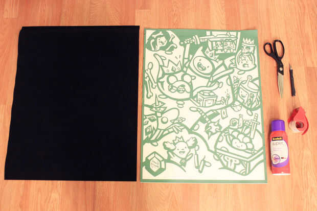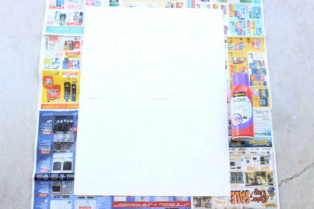 El siguiente paso fue añadir spray pegamento a la parte posterior de la plantilla. ¡ Configurar una zona exterior y presentado algún diario de desecho para evitar que el pegamento del aerosol en todas partes, que es un dolor para limpiar! Luego he añadido una capa uniforme a toda la parte posterior de la plantilla.