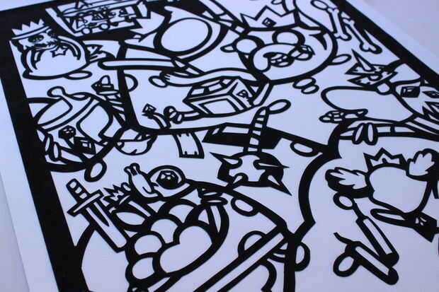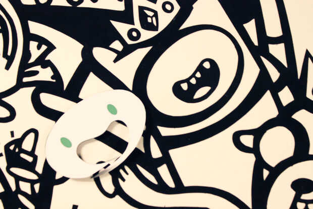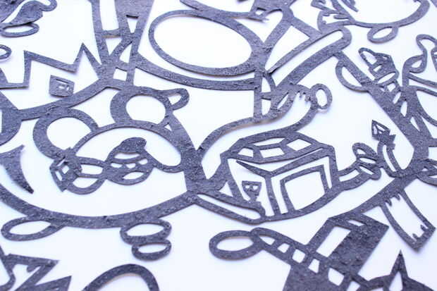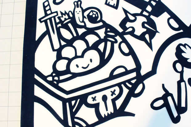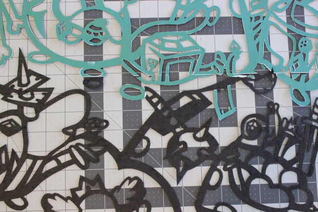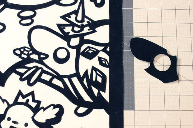 El siguiente paso fue cuidar de esas piezas "flotante" de la cara. Puso hacia fuera alrededor del borde de mi cartel, cerca de donde se va a aplicar. Até cada pieza una a la vez, cortando los pequeños ojos y bocas durante el uso de la pieza base como una guía para la colocación. I retirar la plantilla de papel después de cortar cada pieza y aplica el pegamento a la parte posterior del papel terciopelo y presiona firmemente las piezas en su lugar. Algunos de los globos oculares eran realmente pequeños! Por lo que necesita un poco de paciencia aquí:)