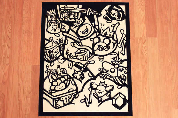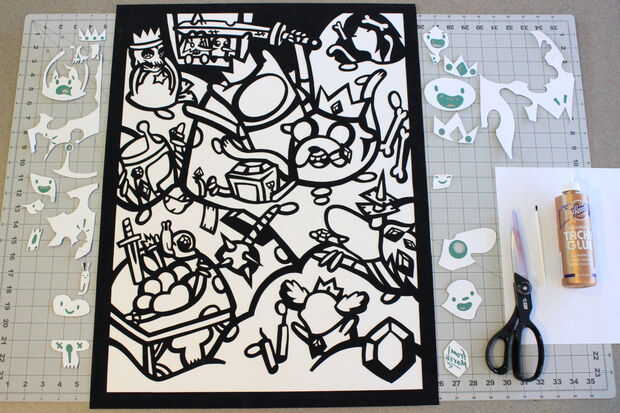 Después el pegamento pegajoso transferí el papel de terciopelo a una mesa, con el lado del terciopelo todavía mirando hacia abajo. Me aseguré que el cartel era recto y que todos los detalles estaban alineados correctamente. Luego coloqué la cartulina del forro en la parte superior el papel terciopelo y presiona firmemente en su lugar asegurándose de que tengo un vínculo muy seguro. (Después de cortar los detalles de diseño intrincado, el papel de terciopelo llegó muy débil, pierde su estructura y fue muy difícil de manejar. Colocando la cartulina del forro en la parte superior el papel de terciopelo no tenía que preocuparse por alinear los delicados detalles.)