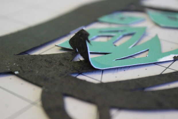 Antes de aplicar el pegamento, quité la plantilla de papel desde la parte posterior del papel de terciopelo, esto no es necesario pero a una adhesión más estricta a la Junta de cartel de respaldo.