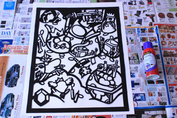 Establecer una zona de pegamento de aerosol utilizando desecho de papel y me puso el papel de terciopelo con el lado del terciopelo hacia abajo.