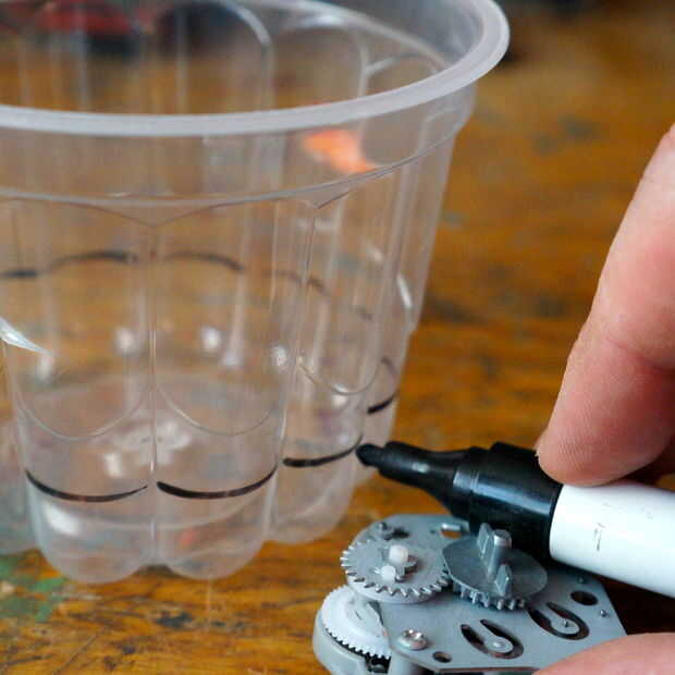 Primero marque dónde cortar la parte inferior de la Copa del interior. La manera fácil de hacerlo es manteniendo un sharpy en la parte interna del temporizador y luego moverse la Copa contra él. Terminará con una marca perfecta (siempre y cuando usted no mover el sharpy)