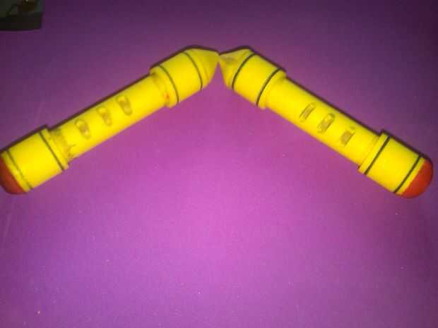 He utilizado 3/8 espiga corta 3 1/4 pulgadas de largo. Envuelta en espuma de 2mm. Corte tres pequeñas "ventanas". Entonces tomé las tiras de 3/4 de pulgada de espuma de 2mm y utilizó el método de lápiz para marcar líneas en ellos aproximadamente de 3/32 del borde y cada borde. El back-end debe ser rematado con una sola capa de 6mm espuma redondeada. y la parte delantera un cono en forma de pieza 1/2 pulgada de largo.