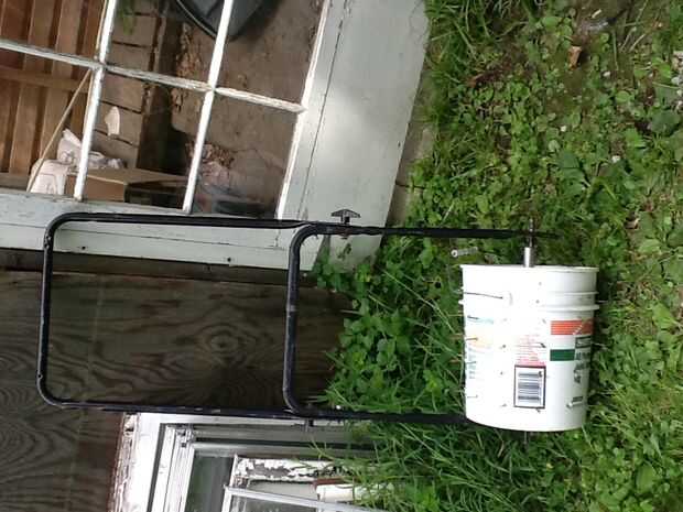 Utilizando un asa de cortacéspedes de césped antiguo rescatado de un cortacésped muerto, simplemente poner un árbol a través del tubo y Unido. Poner unas arandelas entre la tubería y el mango, aunque me pareció innecesario porque mi disposición entera era tan flojo. También, porque el orificio en el extremo de la pieza de la manija el eje pasó por era tan fuerte, que encontré que no necesito casquillos en el extremo del eje.