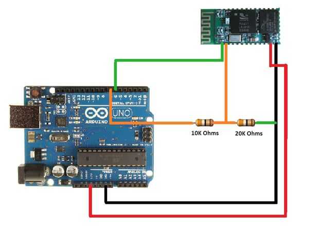 El Arduino Uno tiene una serie de entrada/salida de 5v a través de sus pines, mientras que el módulo de Bluetooth funciona a 3.3v lógica. Debido a esto, un circuito divisor de tensión (nivel desplazador) es necesaria para convertir esta salida de 5v a 3.3v.