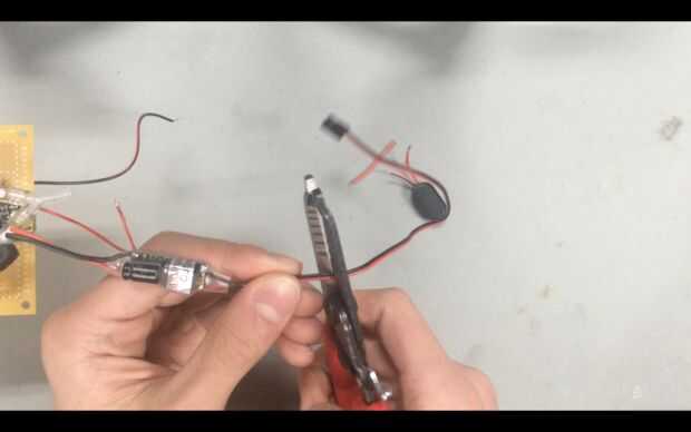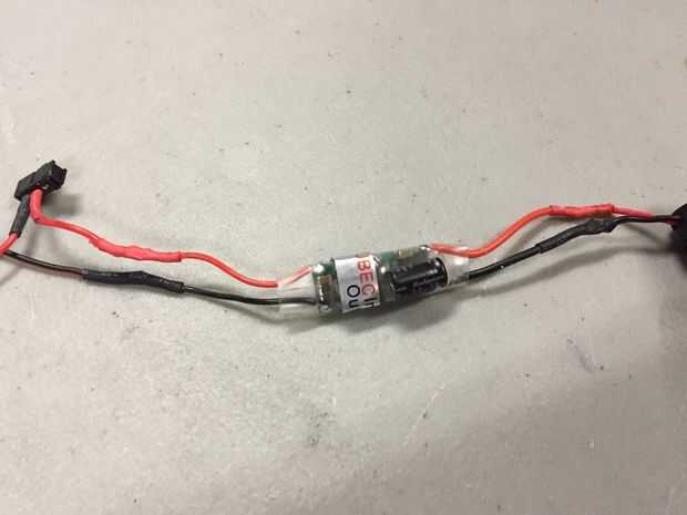 Para conectar el UBEC, cortar los cables rojos y negros del clip de la batería aproximadamente una pulgada de la secuencia sí mismo. Luego cortar los cables de la UBEC en ambos lados y los extremos de la tira. La soldadura de los extremos de la UBEC a los cables negro y rojo en cualquiera de los extremos del circuito. El diagrama de referencia para esto. Nota: Asegúrese de que el UBEC es hacia el camino correcto. El lado con el condensador debe ser la entrada. Asegurarse doblemente de que esto es correcto, o de lo contrario el Abalorio podría desencadenar el monstruo de humo azul.