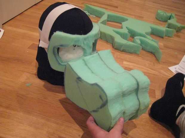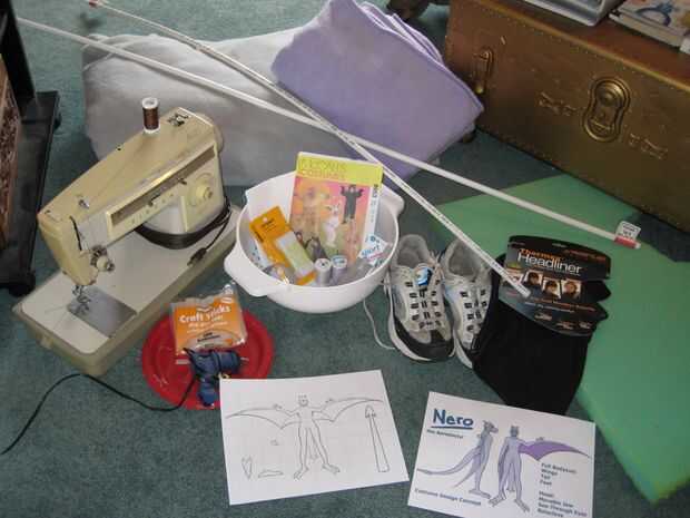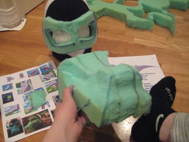 Mono: He utilizado un patrón comprado. Era un patrón solía (solía ser 8953, pero ha cambiado desde entonces) para hacer un mono animal básica para adultos. Seguí las instrucciones y utiliza el patrón que me ayude a empezar. Sin embargo en fotos más adelante verás que acabé modificando el tamaño del traje porque era demasiado grande y holgada. Para ello, tomé un par de pantalones vaqueros y una camiseta básica que me gustaba el ajuste y puso en la parte superior del traje. Luego cortar lo que fuera extra les tamaño abajo para que coincida con mi ropa. Había cosido una cremallera en la parte delantera. En la parte posterior hay un gran pico, que fue tallado fuera de espuma. Un agujero se cortó en la parte posterior y la espiga cubierta cosido en el Body que permite el relleno de espuma ser desmontables.