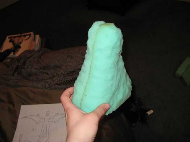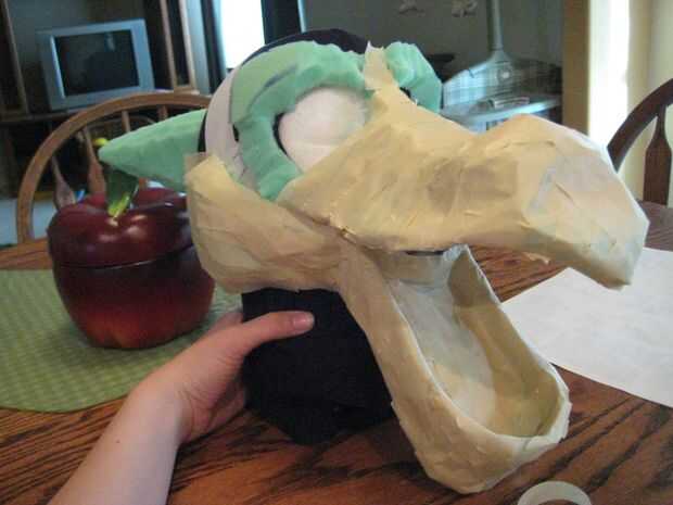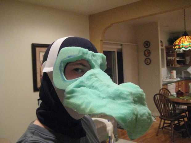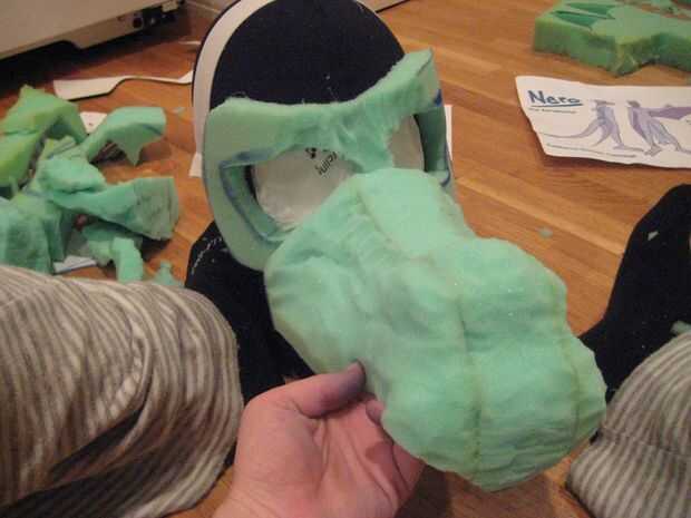 A continuación concedo la parte superior de la boca: esto se hace partiendo la espuma lo que quiero la vista de perfil del hocico para parecerse a. Duplicar esta 3 veces, cortar las piezas y pegar juntos. Me sujete a la espuma debajo de los ojos y comenzar a forjarse su forma. Lo hago para la mandíbula inferior también. Para un movimiento de la mandíbula se recomienda para mantener las mandíbulas superior e inferior de piezas separadas para permitir mayor libertad de movimientos. No olvides detalles como las cejas, cuernos y las mejillas.