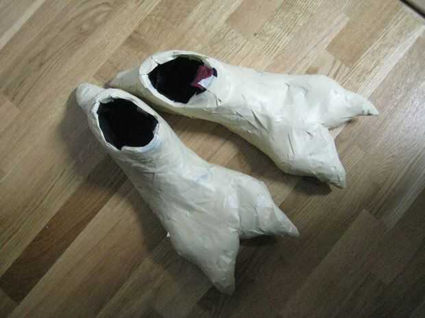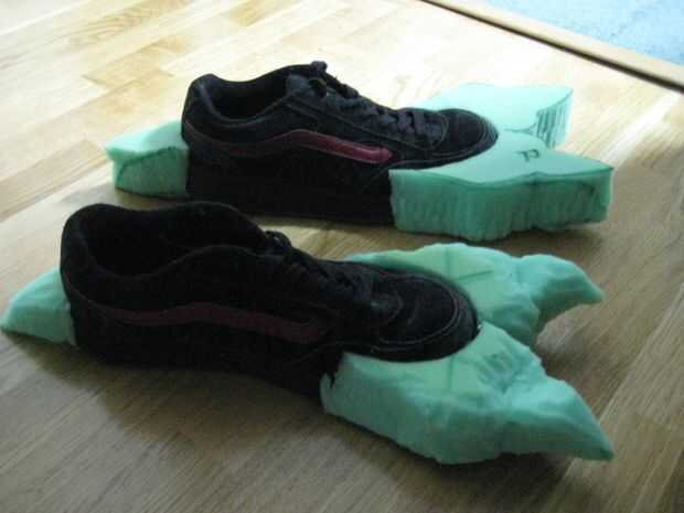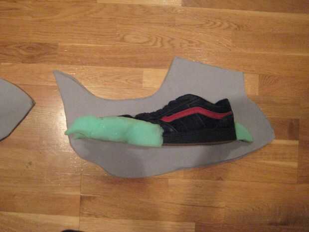 Pies: Los pies se construyen fuera de un viejo zapato tenis. Localizar la parte delantera del zapato sobre la espuma de tapicería y me dibujó un esbozo de mi dedos de los pies de dinosaurio. Usted necesitará duplicar esto en el pie opuesto cada paso del camino. Corte los dedos del pie con un cuchillo del exacto y hotglued a la parte delantera de la zapatilla. Usando las tijeras, tallado hacia fuera de cada uno de los dedos del pie.