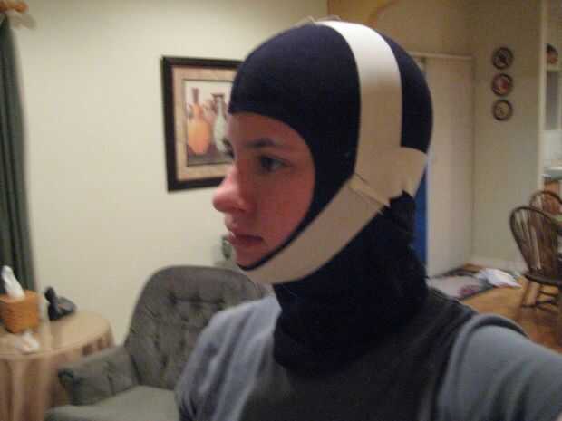 Cubriendo la cabeza en la cinta y la tela es el mismo método como se ha explicado con los pies. A diferencia de mi primera máscara, esta cabeza es casi enteramente cosida. Se puede ver claramente la diferencia de calidad