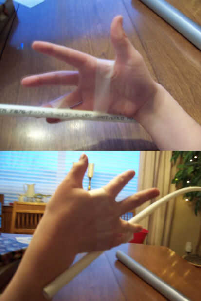 Alas: Las alas eran más bien complicadas. Para obtener el patrón hice mi hermano pone en el piso y sacó de un ala. Lo corte y cosieron los bordes inferiores. Terminé de máquina de coser todo en realidad, que era difícil porque tenía que ser de adentro hacia afuera y empellones a través del orificio en la parte superior de la muñeca. El borde superior del ala alberga un tubo de pvc y está conectado a mi mano con un pedazo de elástico que envuelve mi palm. El tubo se apoya sobre todo en la parte posterior o inferior de mi muñeca. La pipa también es extraíble para fácil almacenamiento y transporte.