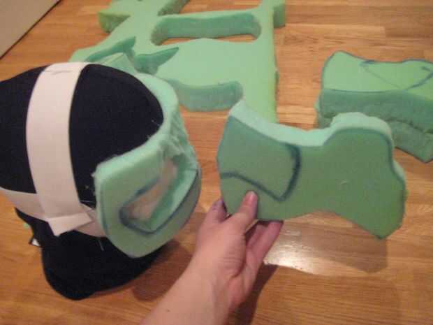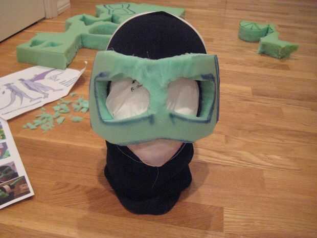 Desde aquí se trata de esculpir el aditiva y sustractiva de la espuma con unas tijeras. Se pegue la espuma directamente sobre el pasamontañas. Esto ayuda a tener una base principal apoyo a su trabajo, utiliza un soporte de cabeza/peluca de espuma de poliestireno, pero esta cabeza es más pequeña que el mío así que le sugiere lo que abulta un poco. De lo contrario Asegúrese de que es cómodo y se ajusta bien sin ser demasiado intentando constantemente como trabajas. Siempre empiezo con los ojos para saber donde será mi visión y cómo es grande los ojos van a estar en comparación con el resto de la cabeza a proporciones del equilibrio. Hacer una plantilla de ojo de papel para ello. Construir para arriba alrededor de los ojos primero.