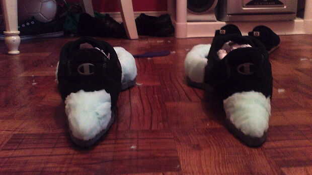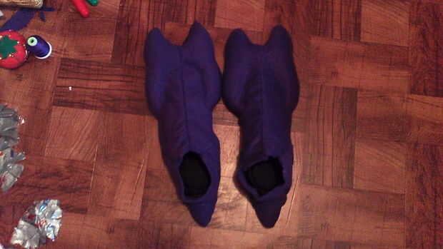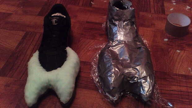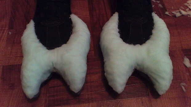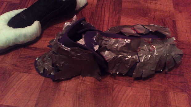 Los dedos del pie en forma de espuma de tapicería verde y aplicados a la espuma de EVA con un montón de madre de pegamento caliente. Entonces simplemente creé a tela patrones con plástico transparente envoltura y cinta adhesiva.