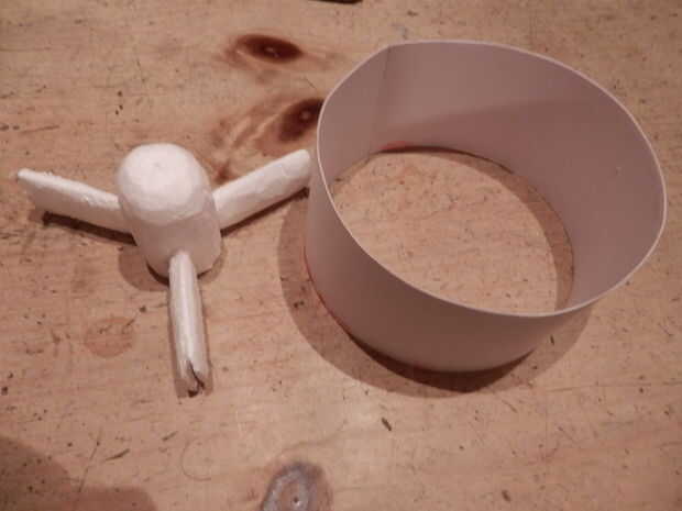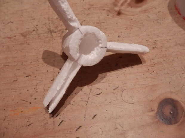 lo mismo pasa con la Asamblea interna en forma de tri que fortalece el conducto y mantiene el motor, el pedazo de centro es tallado y lijado en forma cilíndrica y un lápiz empujado hacia adentro para crear el agujero para el motor, mientras que los radios son elementos de la cuidadosamente alisado polysyrene de la misma longitud que se pegan al pedazo de centro.