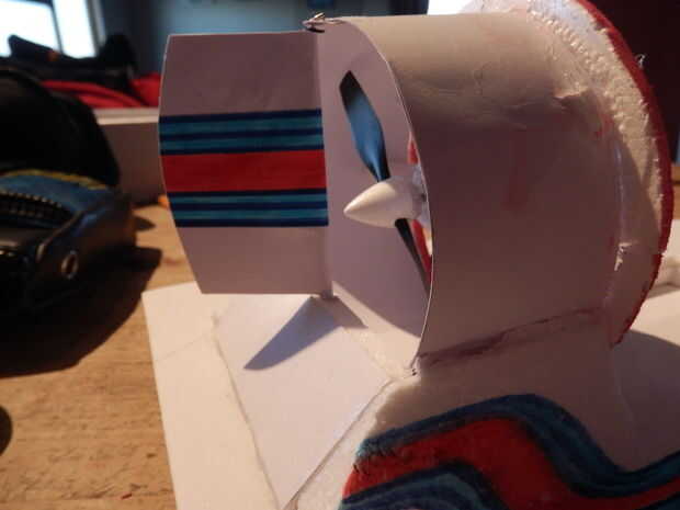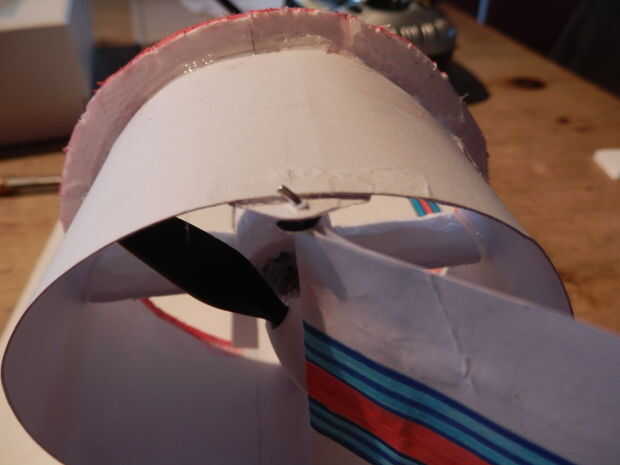Ahora puede preparar el conducto para el montaje del timón, se hace un pequeño agujero con un alfiler en el centro de la la parte superior del conducto para tomar el eje de clip, habla de que esto es simplemente un gran clip doblado hacia fuera recto pero con una pequeña torcedura en la parte superior como se muestra en la segunda foto.