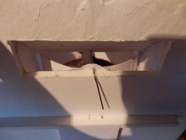el clip a continuación se empuja a través de un agujero en el centro superior del conducto y dowm a través del agujero en el conducto. una vez terminado un pedazo rectangular de papel grueso con pegamento aplicado a un lado se dobla alrededor del eje del clip por lo que las partes cumplir con y permanecer juntos.