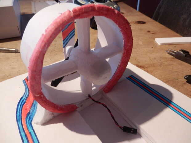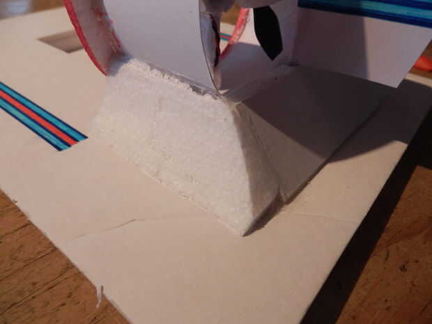 el conducto de aire está allí para un cuarto del aire de los ventiladores de canal hacia abajo en la falda, utiliza una otra pieza de la espuma de depron-como había cortado en un rectángulo pequeño 80x36mm y hace 45 grados chaflán en los dos bordes largos que esto entonces cabe comodamente detrás el conducto como se muestra en la primera foto. al lado de la tolva hay también algunos pedazos tallados agradable de poliestireno que dejar aire escape por los lados de la tolva y el aerodeslizador mirar un poco más agradables estéticamente.
