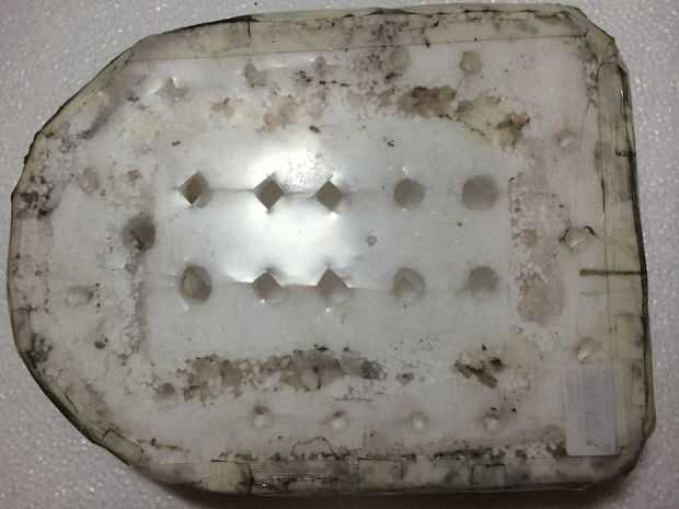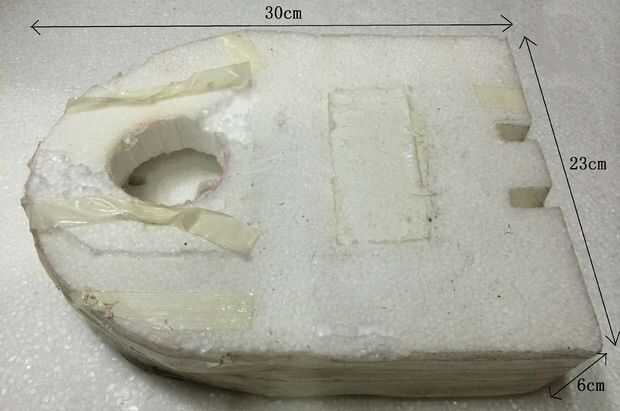 Construimos la base del aerodeslizador mediante tablero de la espuma y pegamento de espuma. La base de la espuma es de 30cm de largo, 23 ancho y 6cm de espesor. Consta de 3 capas, cada 2 cm de grosor. Nos haga un agujero en la capa superior para que el ventilador se ajusta en el agujero. También, dos muescas están perforados en la capa superior para sujetar los servos. La manera en que las 3 capas apilar juntos forma una cámara de aire en el medio que permite el flujo de aire generado por el ventilador de elevación. Hemos grabado un trozo de carpeta de plástico en la parte inferior para reducir la fricción entre el la base y el suelo.