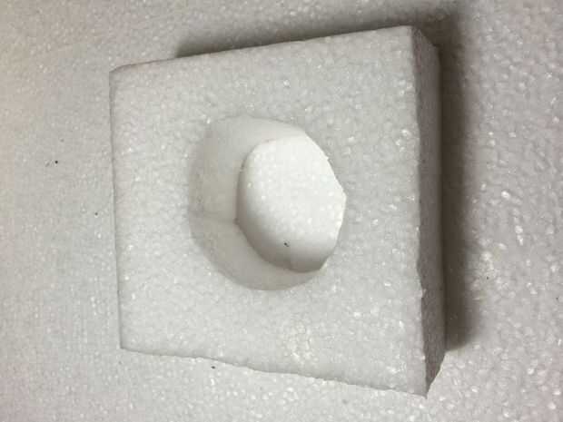 A continuación, cortamos el tablero de la espuma gruesa de 5cm a 13cm por cuadrado de 13cm y perfore un agujero en el centro para que el ventilador canalizado se ajusta en el agujero. Luego de pegado el ventilador en el agujero y agregar el pegamento para reforzarla. Cortamos piezas de los bordes del cuadrado en forma redonda para que coincida con la forma de la mejor base.