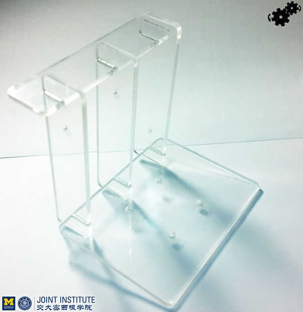 - Enchufe los tres tableros rectangulares a la base rectangular horizontal del timón. Recuerde no empujar el corte común de la bayoneta, porque el tablero de acrílico es crujiente.