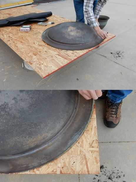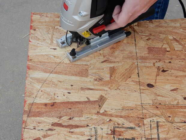Tomar un objeto circular y alineados con los lados de una esquina de la madera contrachapada. Trace el borde de su objeto de circular en las esquinas del tablero. Ver la cuarta foto. Si quieres más curvas en las esquinas, utilice un círculo más pequeño. Utilizamos una cuenca de fuego grande que tiene un diámetro de 3 pies para medir los ángulos.