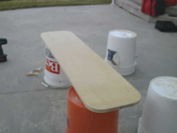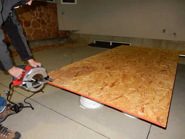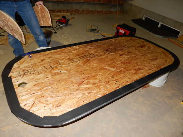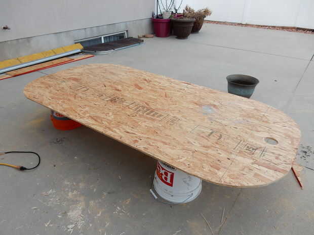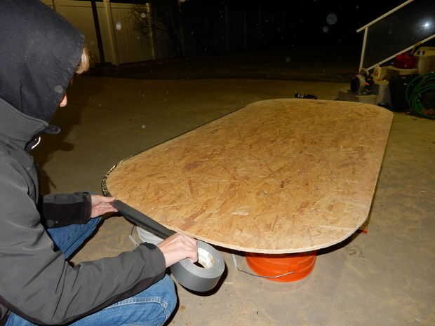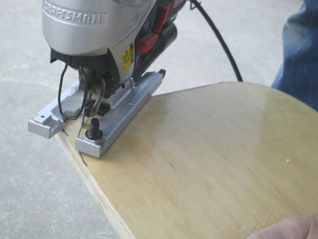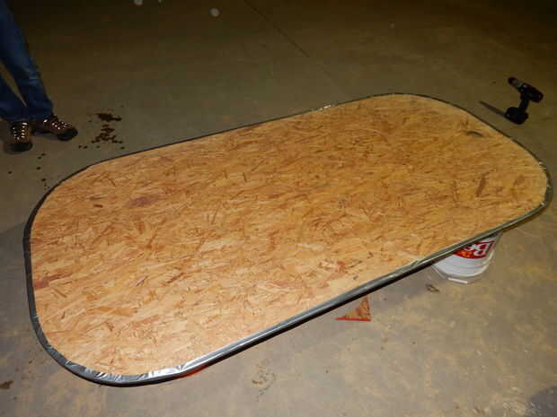 Comenzar por la medición de las dimensiones largo y ancho que desee el aerodeslizador que. Medimos nuestro ser 40 x 80 pulgadas. Nuestro oficio es en forma de rectángulo con esquinas redondeadas, pero no dude de su propia forma de pensar si quieres diferente. Marque las líneas con un lápiz o un marcador y recorte los bordes con una sierra circular. Asegúrese de usar protección ocular cuando utilice cualquier tipo de sierra para evitar lesiones. Ver las dos primeras fotos.