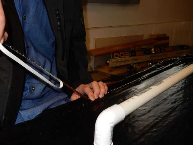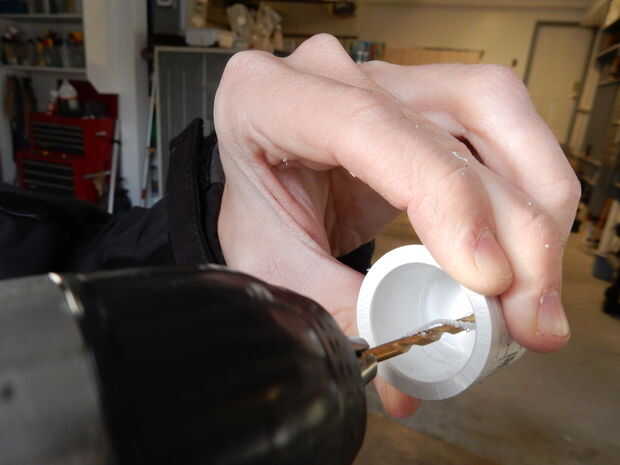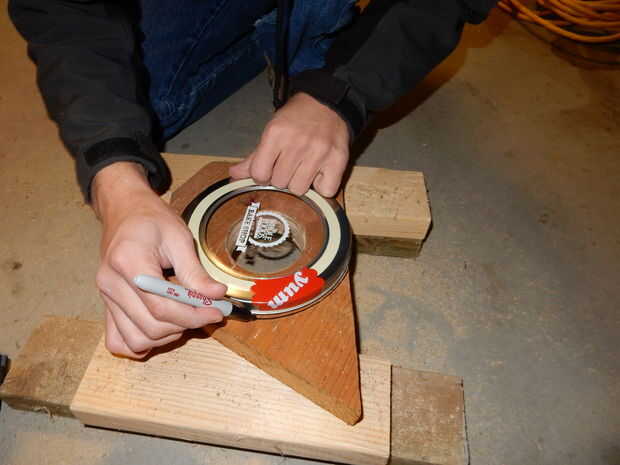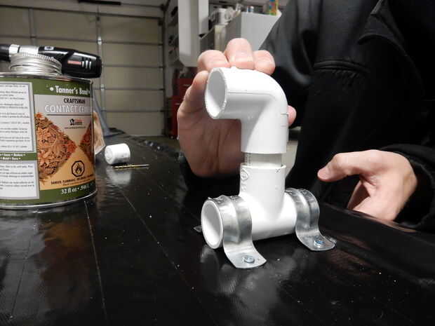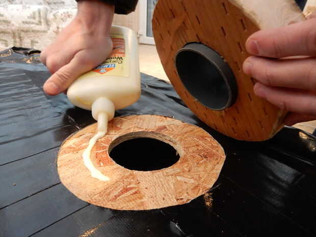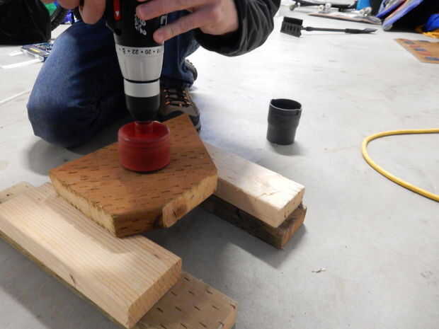 Si no te gusta grabar el soplador de hojas directamente en el agujero, hacer un montaje de un soplador de hojas inyector y una gruesa pieza de madera de desecho. Primero corte el extremo de un accesorio soplador de hojas que enlaza directamente sobre el ventilador sí mismo. Cortar para que el extremo abierto se extenderá más allá del trozo de madera que van a poner a través de 1/2 una pulgada. Trazar la abertura en la madera y cortar el círculo con la misma broca utilizado en la base de madera contrachapada para el agujero. Rastrear un objeto circular (o medir dos pulgadas a los lados del accesorio y corte un cuadrado de la forma si usted quiere una plaza) sobre el agujero que se extenderá más allá del borde del agujero de al menos 2 pulgadas. Recorta el anillo de madera con una sierra de calar y coloque el accesorio a través del orificio. Poner cuatro tornillos de la longitud adecuada a través del lado del anillo o plaza con el accesorio en ella para que mantenga en el medio y el palillo a través del lado del accesorio de plástico sobre una mitad de una pulgada (véase el cuadro 9 del montaje de Motor). Cortar un círculo en la cinta alrededor del agujero para exponer la madera contrachapada. Extiende pegamento para madera alrededor de la madera expuesta y pegar el Monte. Tornillo en algunos tornillos para asegurar el monte abajo sobre el pegamento y el agujero, asegúrese de que el soplador de hojas se enfrentarán a la manera correcta cuando se pone. Siente la parte inferior del plástico donde esta atornillado en el tablero para asegurarse de que ningunos tornillos están asomando por el otro lado! Ellos rasgón el plástico! Ver las fotos del montaje del motor para la referencia.