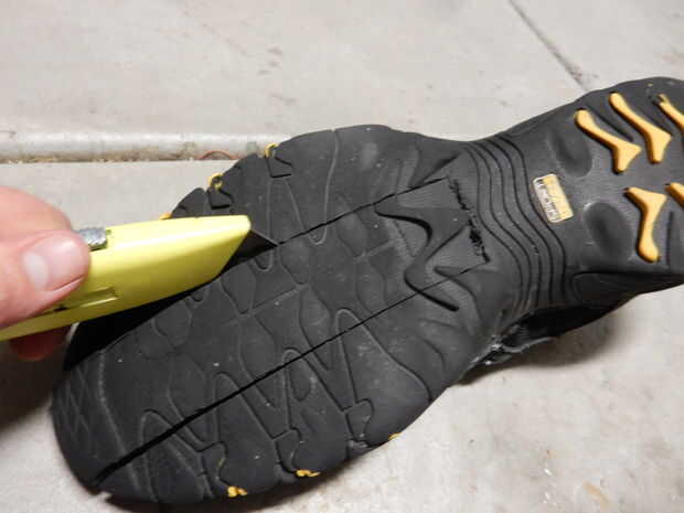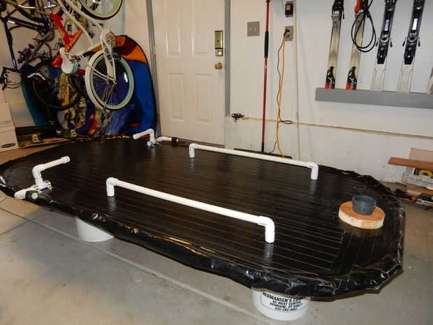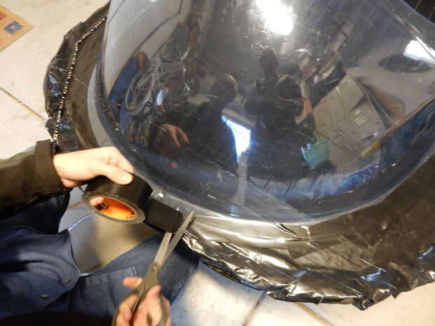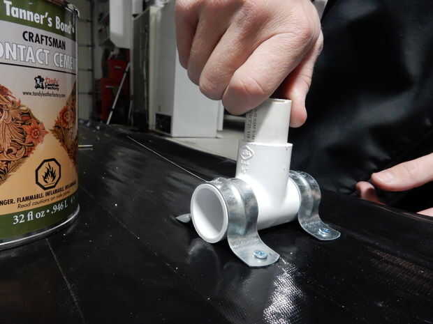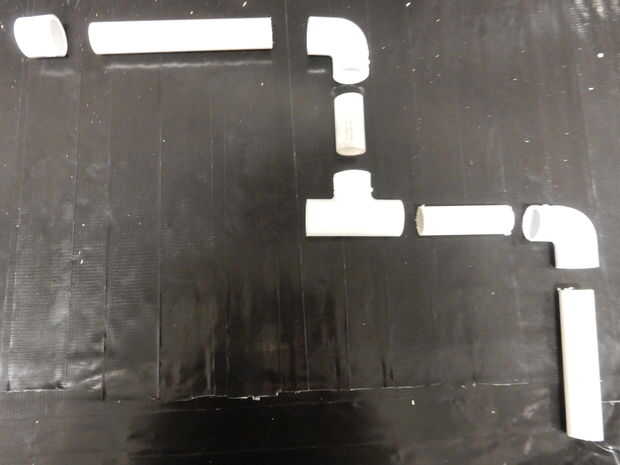 Utilizamos cinta. Tomó 2 rollos de cinta de gorila negro para cubrir toda la superficie. Comenzamos en el borde exterior de la nave y se trasladó a la mitad, un poco superpuestas para la buena medida. Vas a querer usar tijeras para cortar los hilos pues rasgando sus dedos crudos muy rápidamente.