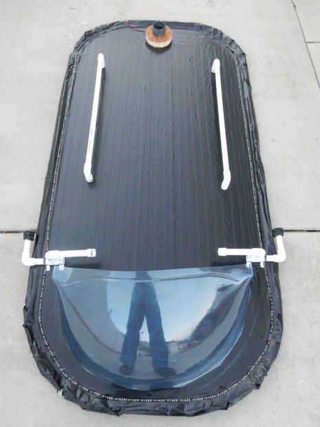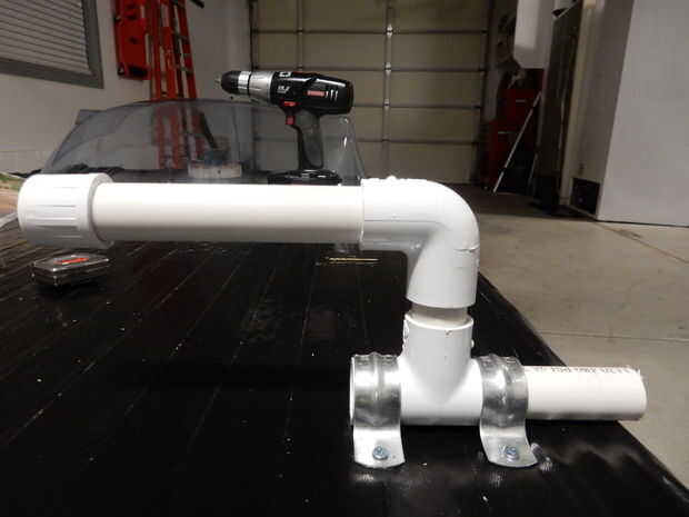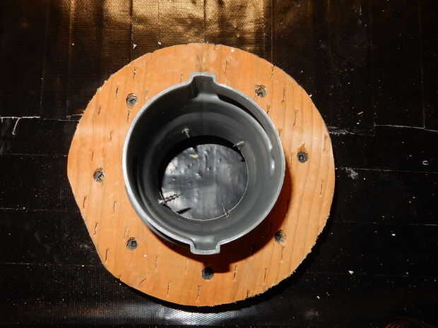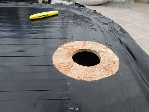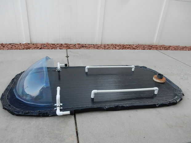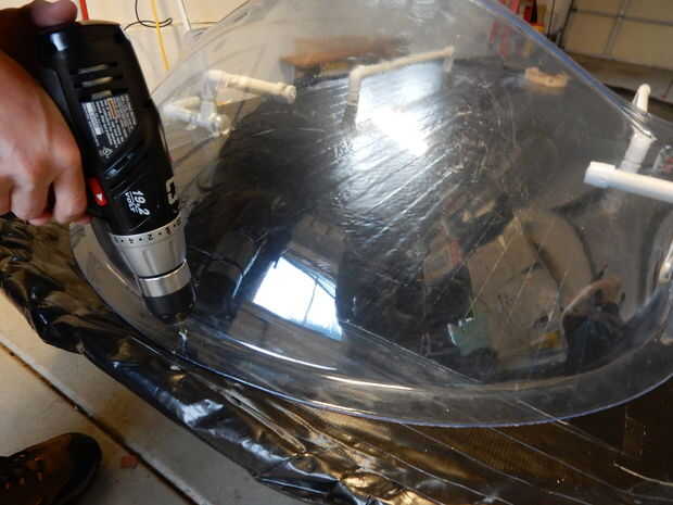 Use una tapa plástica de la ventana. Que utilizamos es de $20 en Home Depot. Que ser de plástico transparente y una forma redondeada en su mayoría, tienen unos cuantos modelos a la venta, así que elegir uno que crees que se vería mejor. Para llegar a ser un poco más alto y redondo, empuje en los lados que arquea hacia arriba. Utilice tornillos de media pulgada para atornillar a la madera contrachapada y cubrir el borde en cinta que coincida con la placa.