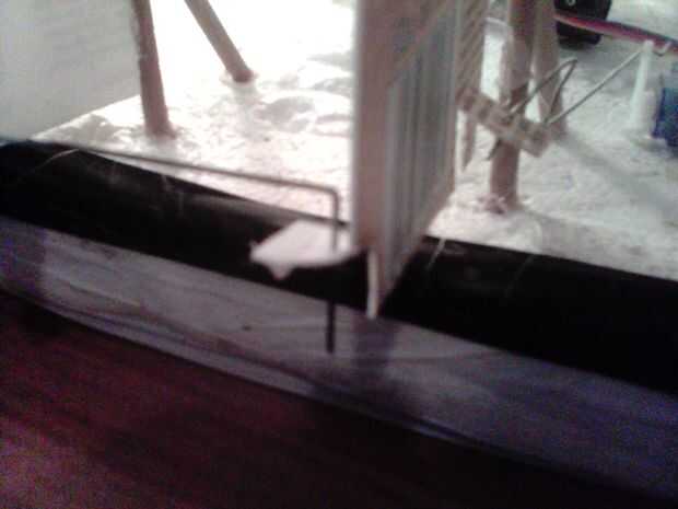 Para el marco de corte dos pedazos de pasador 180mm de largo y dos de 50 mm de largo. Meter las dos partes de 180mm largo 70 mm., 20 mm. en el poliestireno en la parte trasera de la base entonces utilizar las piezas pequeñas como soportes y pegamento en lugar.