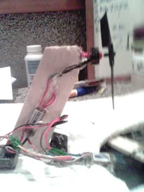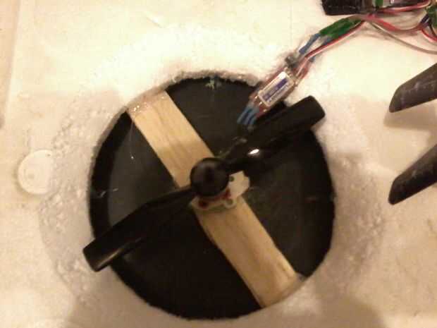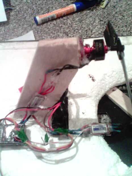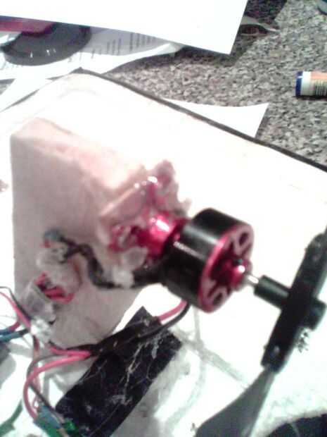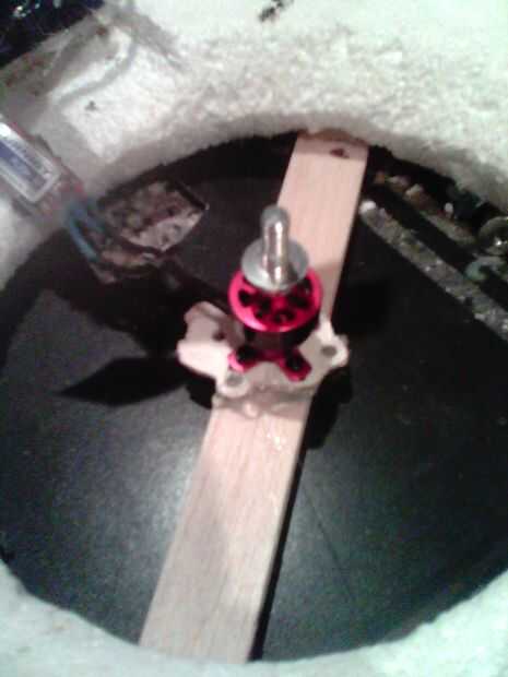 Primero pegue el ventilador de elevación en la parte inferior plástico en el centro del agujero en la base, esto puede necesitar un poco de refuerzo con madera de balsa para detener el fondo combado. El ventilador de empuje necesita un soporte para mantenerlo por encima de la base para no chocar con el ventilador de elevación o base, esto fue sólo un rasguño de madera de balsa pegado en la base de la el motor estuviera pegado justo en la parte delantera. Ahora puede montar el ventilador de empuje, asegúrese de que las cuchillas no toquen como giro de ambos motores.