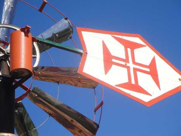 He pintado una cruz de Cristo en guiar porque creo que tiene cierto parecido con las velas de los barcos portugueses que lleven este símbolo. Vela en el viento, es el viento que mueve estas naves, que también sucede con la turbina de viento. Es que por qué y como muchos de los buques que allí.