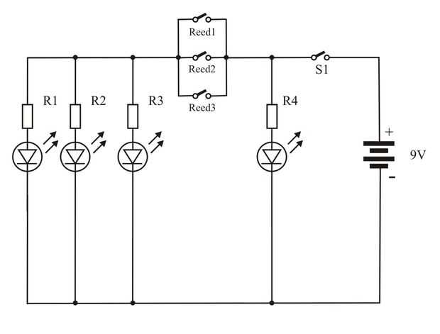 Trabaja como sigue: para girar las turbinas, el imán activa el interruptor de láminas, conectar los LEDs. El más rápido giro, el más rápido el LED enciende y apaga, dando la impresión de en que está siempre.