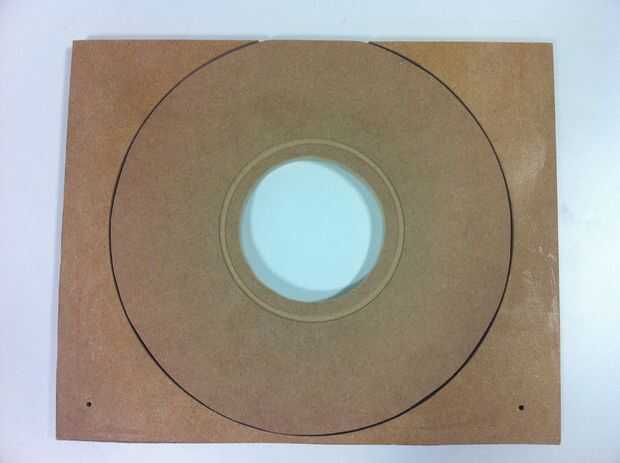 La base estaba hecha de un trozo de 415 x 340 mm de MDF (tableros de fibra de densidad media), 18 mm de espesor. Se cortó un agujero en esta base utilizando un router. Un disco de 320mm de diámetro fue hundido y pegado en su lugar.