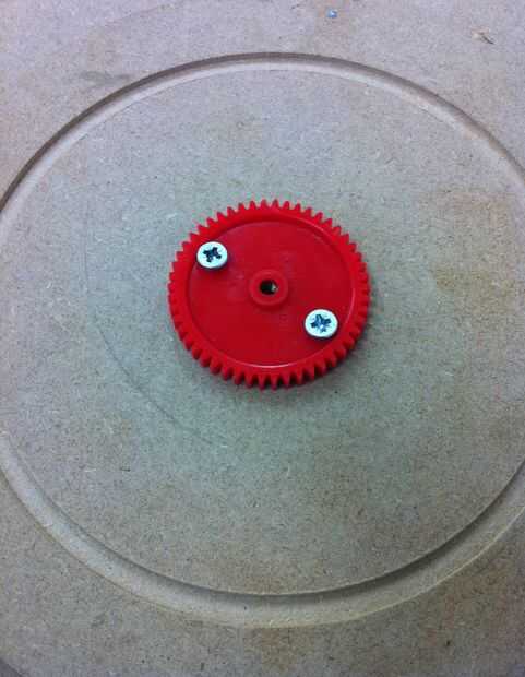 El engranaje grande se enrosca en el centro de la base del ventilador. Dos agujeros fueron perforados a mano en el engranaje y los tornillos se perforaron. Este engranaje crea una relación de engranajes para aumentar las rpm el eje del generador está girando (y por lo tanto, disminuyendo el esfuerzo de torsión).
