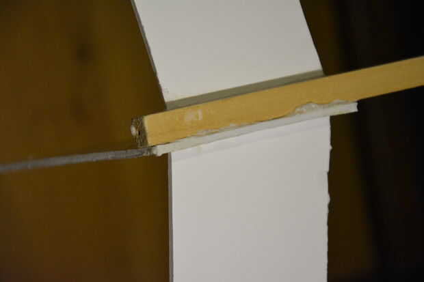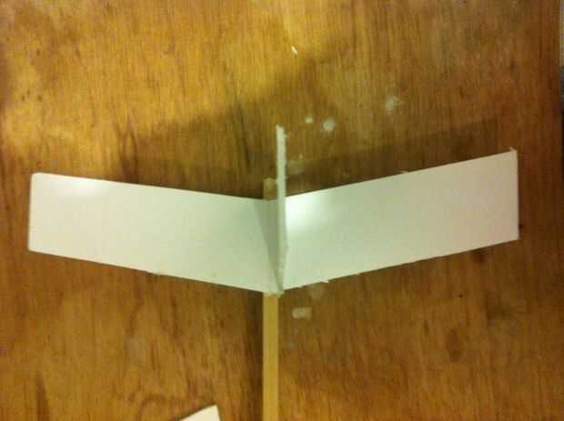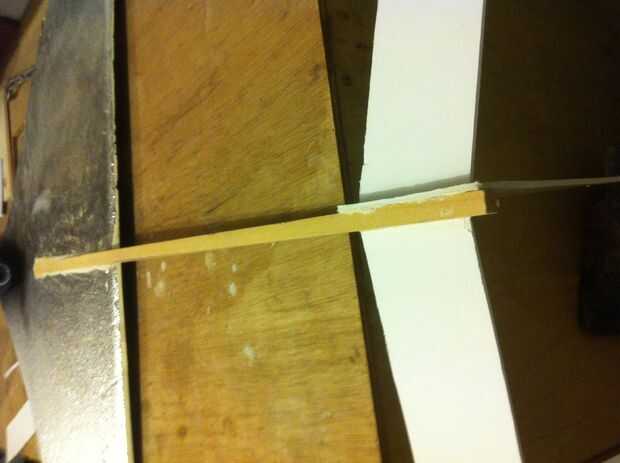 - Encolar el listón de la ala en su línea de centro. la malla debe extenderse el ala de 50 cm. Esto es necesario para un buen vuelo, de lo contrario que terminarás con un cohete en vez de un avión.