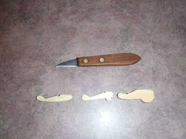 (Con cuidado) redujo el espacio en blanco para que coincida con el perfil del avión y el ancho. Digo con cuidado porque las maderas más blandas utilizan dividir y cizalla más fácilmente si no cuidado. La primera imagen de muestra la progresión de la talla de (derecha a izquierda). También es el cuchillo que hice usando un cuchillo de cocina de que tomé por 10 centavos.