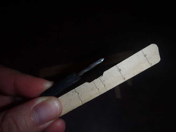 Primero traté de cartón de caja de cereal para las alas, pero es muy difícil. Encontré un 24 "x 1 1/2" x 1/8" tira de alguna madera blanda que se afeitó apagado de un poco de madera para un proyecto previamente. trabajó mucho mejor para las alas. Sólo trazar patrón ala y cortar con un cuchillo o exacto. Luego he utilizado un punzón (hecho de un clavo envuelto con cinta de hockey) para colocar los agujeros que me ayude a mejor colocar los puntales del ala (hechos con palillos de afeitado-abajo). Posiciones de los orificios se colocan (por supuesto) según medidas en los planos. Segunda imagen muestra ala en progreso. No olvide lijar los bordes.
