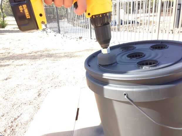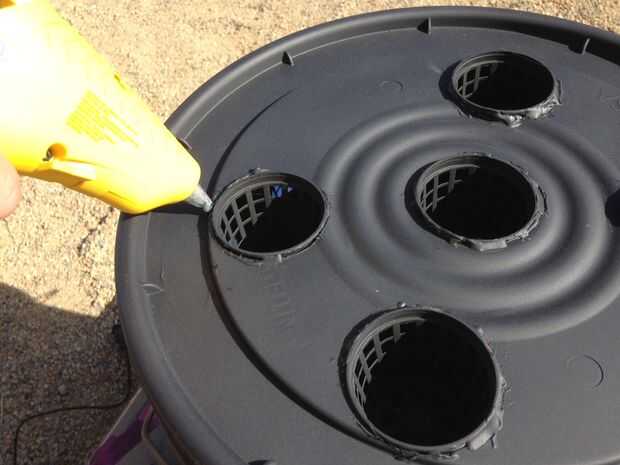 En este paso, usted va a crear agujeros en la tapa de las ollas netas. Se recomienda crear cinco agujeros con la sierra que es apenas lo suficientemente grande como para contener las macetas netas que están igualmente espaciadas y marcadas. Entonces utilizas el serrucho para hacer los agujeros, y finalmente, limpia los agujeros una vez que se realiza y caliente pegamento netas macetas en su lugar. Usted puede necesitar pintar la tapa otra vez después de este paso.