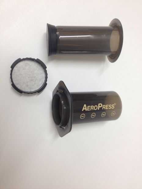 Una vez que estén apartes pone el émbolo hacia abajo y conecta el cilindro con la malla del filtro, asegurándose de que la malla quede horizontal. Su café puede ser arruinado si el papel se desliza, así que esto es muy importante! Le dan un giro hacia la derecha y el filtro debe ser agradable y firmemente conectados. Puede ver la cerradura de los dientes en su posición sobre el labio de la prensa, así que mantener un ojo en esto, si no está seguro. Cuando bien apretados los dientes deben ser completamente ocultados.