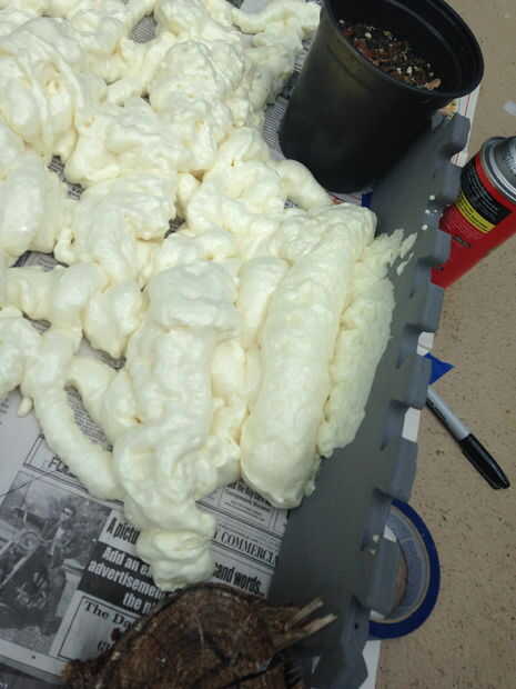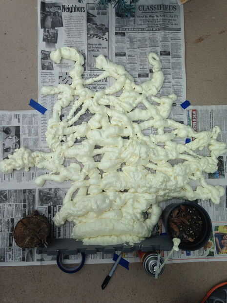 Muy bien, así que presenta algún diario suficientemente grande para contener el tamaño entero del coral que yo planeaba hacer. Dibujarlo hacia fuera, pero terminó por hacer mi propio patrón en el final. Corté un trozo de espuma para la base de modo que tenía algo que lo ayude a levantarse con y había asegurado en su lugar con lo que tuve que poner alrededor. A continuación tengo una lata de aerosol espuma y fumigación comenzó a tiras al azar de coral y luego conectar las líneas con criss cross formas y patrones. Entonces deje que este seco completamente.